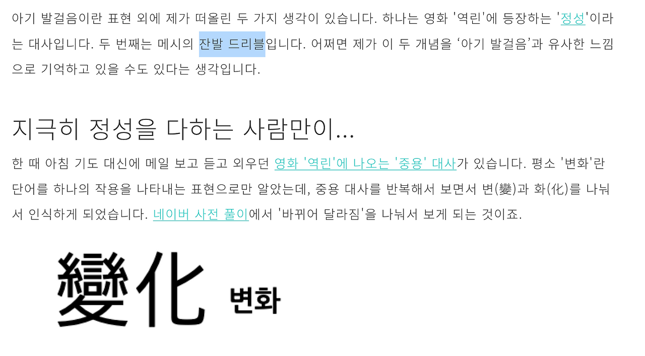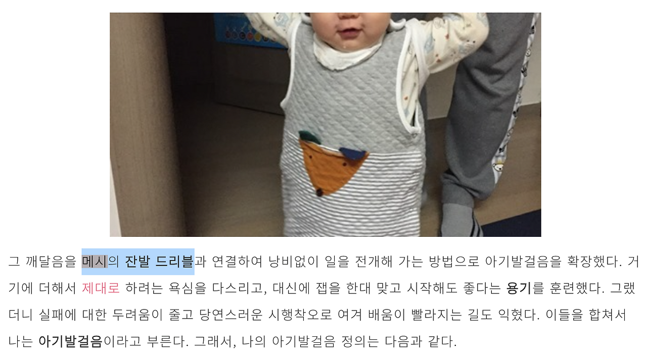 여기서 잠시 축구 밖의 이야기를 하겠습니다. 평소 '잔발 드리블'을 은유로 많이 써왔는데, 브런치 검색을 해 보니 두 곳에 흔적이 있습니다. 하나는 무려 2년 전에 쓴 <저는 의지를 믿지 않습니다>에 등장합니다. 아기 발걸음과 잔발 드리블을 유사 개념으로 설명한 글귀네요.