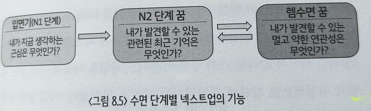 렘수면 동안 해마에서 일화적 기억 재생이 차단되면 신경전달물질인 아세틸콜린이 증가하고 노르아드레날린은 차단되어 약한 연관성을 탐색하는 연상적 네트워크로 기울어진다. 렘수면에서 의미 점화 역시 약한 연관성을 활성화하는 편을 선호한다. <중략> 일화적 기억을 현실적으로 재생하는 현상은 넥스트업의 실패를 의미 <중략> PTSD 환자들이 겪는, 거의 매일 밤 그들의 꿈에서 나타나는 실제 외상 기억의 재생이다. <중략> PTSD로 과다 각성 상태가 되면 노르아드레날린 분비가 차단되지 못하고 넥스트업은 이런 탐색을 할 수 없다.