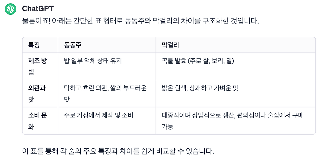 ChatGPT에게도 표로 만들어 달라고 했습니다.