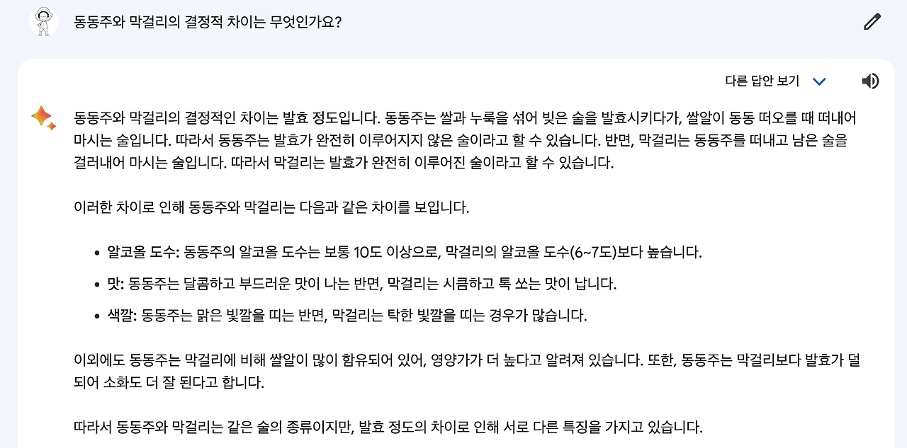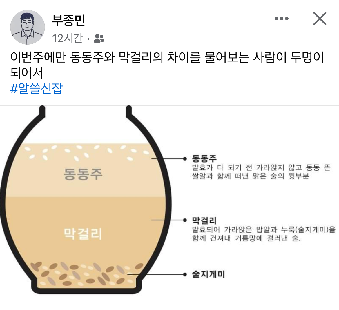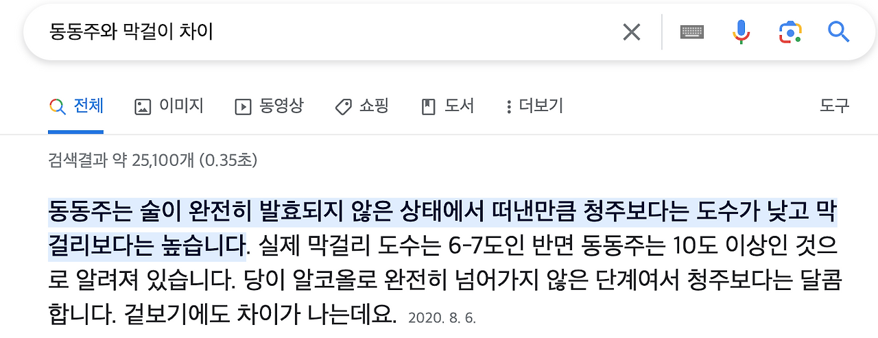 그런데 처음 볼 때는 피곤해서 그랬는지 눈에 잘 들어오지 않고, 습관적으로 '동동주와 막걸리 차이'를 키워드로 구글링을 했습니다.