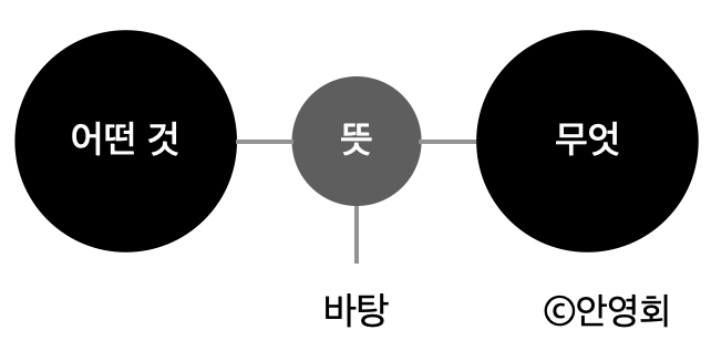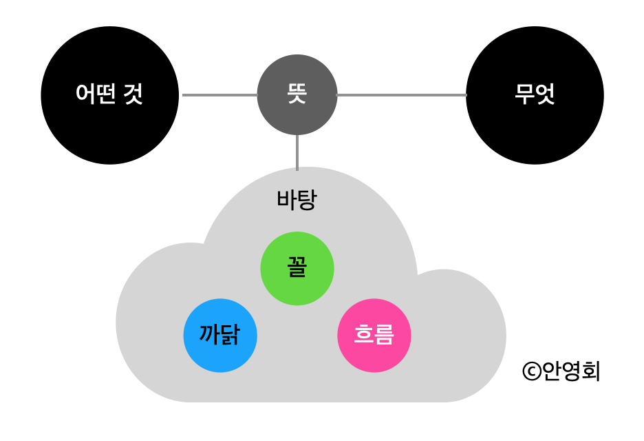 사람들은 ‘파래’나 ‘쓸개’에서 비롯하는 느낌을 가지고서 ‘빛깔이 파란 것’과 ‘맛이 쓴 것’이 무엇을 뜻하는지 또렷이 알아볼 수 있다. 이때 ‘파래’나 ‘쓸개’는 뜻이 비롯하는 무엇을 가리키고, ‘빛깔이 파란 것’과 ‘맛이 쓴 것’은 뜻이 드러나서 이루어지는 어떤 꼴을 가리킨다. ‘파래’와 ‘빛깔이 파란 것’, ‘쓸개’와 ‘맛이 쓴 것’은 서로 뜻을 기대는 관계를 넘어서 뜻이 비롯하는 바탕을 같이 하는 관계로 나아가 있다.