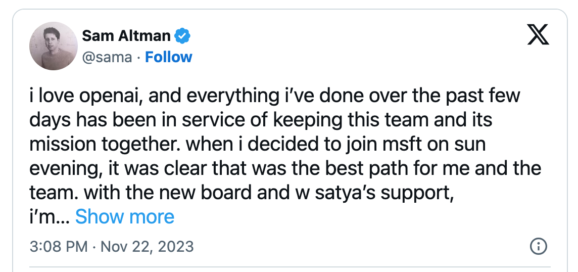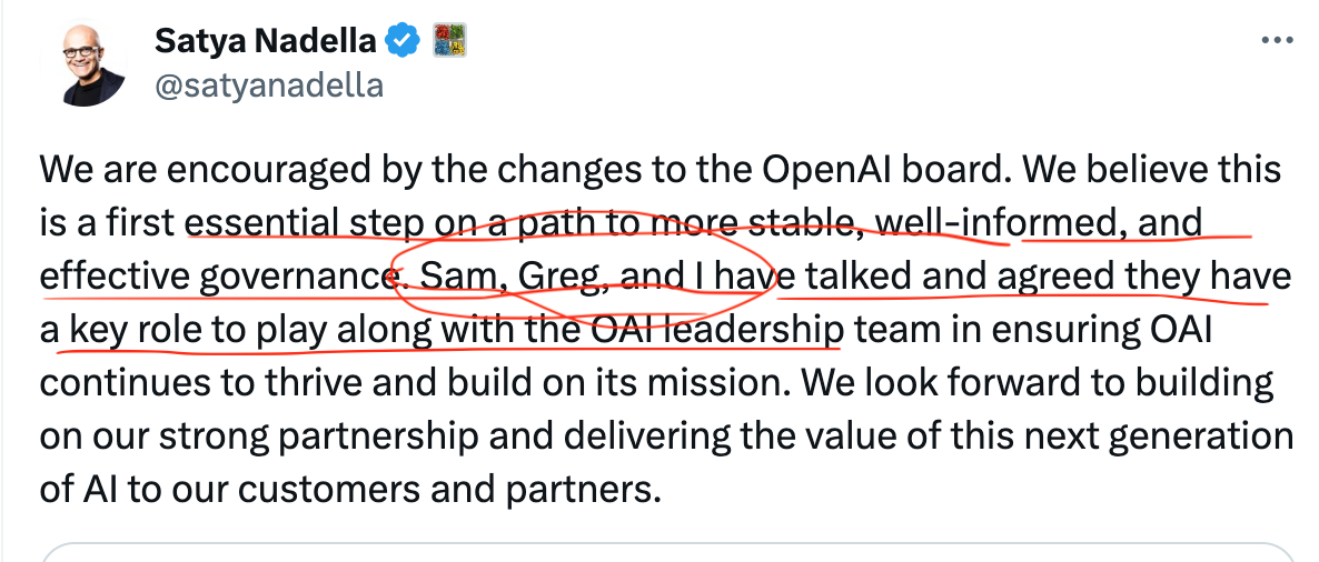 앞서 해고된 샘 알트먼 등을 채용한다고 X에 올렸던 사티아 나델라는 또 발 빠르게 논평을 내놓습니다. 잠시 해고되었던 둘과 함께 셋이서 리더십을 발휘할 것 같은 뉘앙스가 느껴지는 글입니다.
