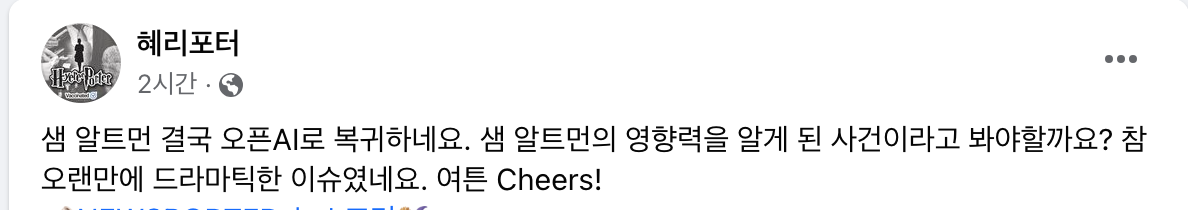 다른 페벗 님들 다수가 인용한 기사를 보니 <OpenAI brings Sam Altman back as CEO less than a week after he was fired by board>라는 CNBC 기사였습니다. CNBC는 알트먼의 X 글을 인용하고 있었습니다.