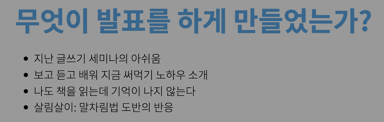 이런 독서 기술의 숙련을 어떻게 삶에 결합할 수 있을 지에 대해 보다 분명하게 해 보려고, 지난달에는 가까운 사람들 앞에서 발표까지 만들어서 했습니다.