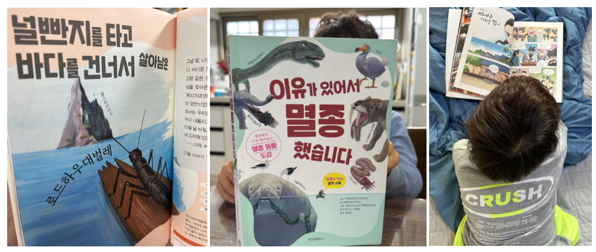 아이가 아무렇게나 둘러 대는 모습을 보면서 '아빠가 알려줄까'라고 학습을 유도했습니다. 둘째의 책 읽기 방법 중 하나는 형의 책을 그냥 보는 식입니다. 포켓몬 도감으로 한글을 떼는 장면을 몰랐더라면, 어쩌면 아이가 어떤 방식으로 정보를 습득하는지에 대해 전혀 모르고 살았을 뻔했다는 생각이 듭니다.