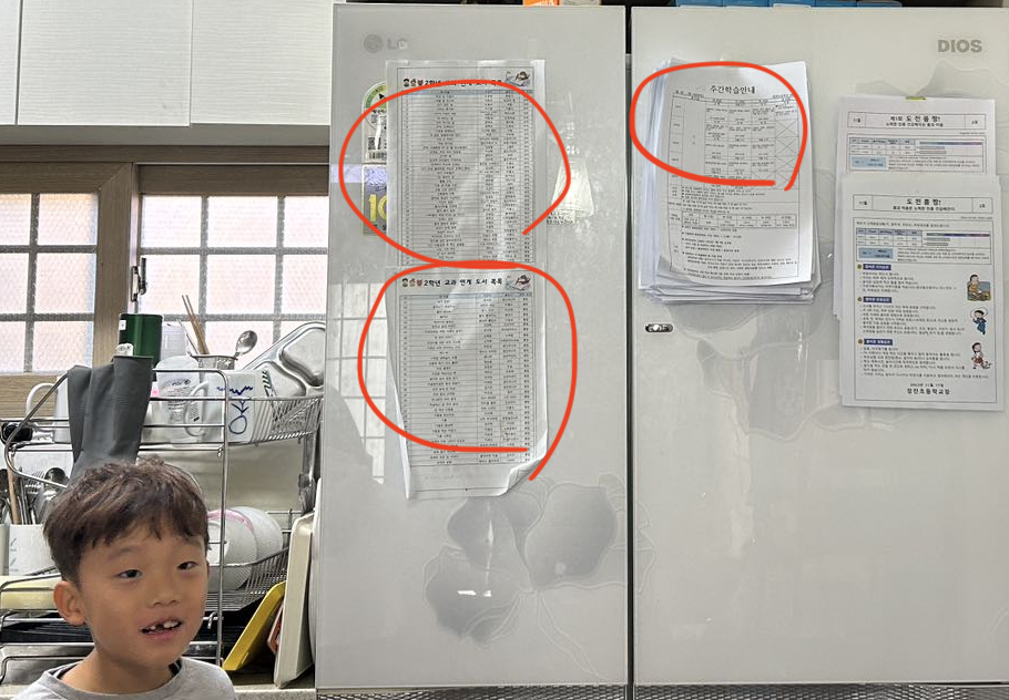‘이렇게 두 개가 비슷한 것을 뭐라고 하지?’라고 물었습니다. 아이와 대중목욕탕에 가서 타일 모양이 모두 비슷한 것을 보며 '패턴 놀이'[1]를 했던 기억을 불러왔습니다. 이렇게 대화를 하다가 고개를 돌려 보니 냉장고에 붙어 있는 종이에 표가 잔뜩 있었습니다.