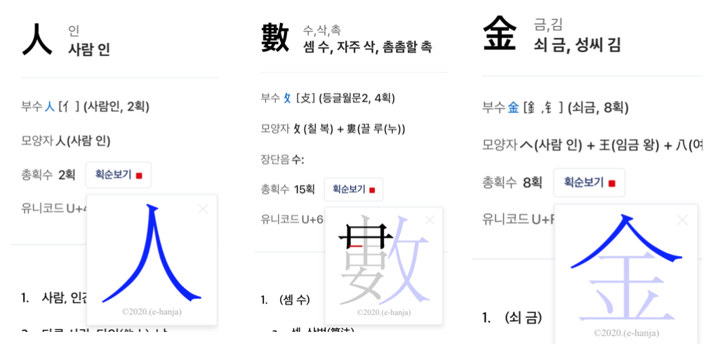 다시 획순 보기를 활성화 한 스마트폰을 아이 앞에 내놓습니다. 그리고 '그만할까?' 아니면 '하나만 더 쓸까?'하고 아이에게 그만두는 기준을 정할 기회를 제공합니다. 아이가 두 개만 더 쓰겠다고 말합니다. 그리고 '쇠 금(金)'을 선택하더니 이어서 '물 수'와 '손 수' 말고 어려워도 좋으니 새로운 '수'자를 쓰고 싶다고 해서 제가 '셈 수(數)'자를 찾아 제시했습니다.