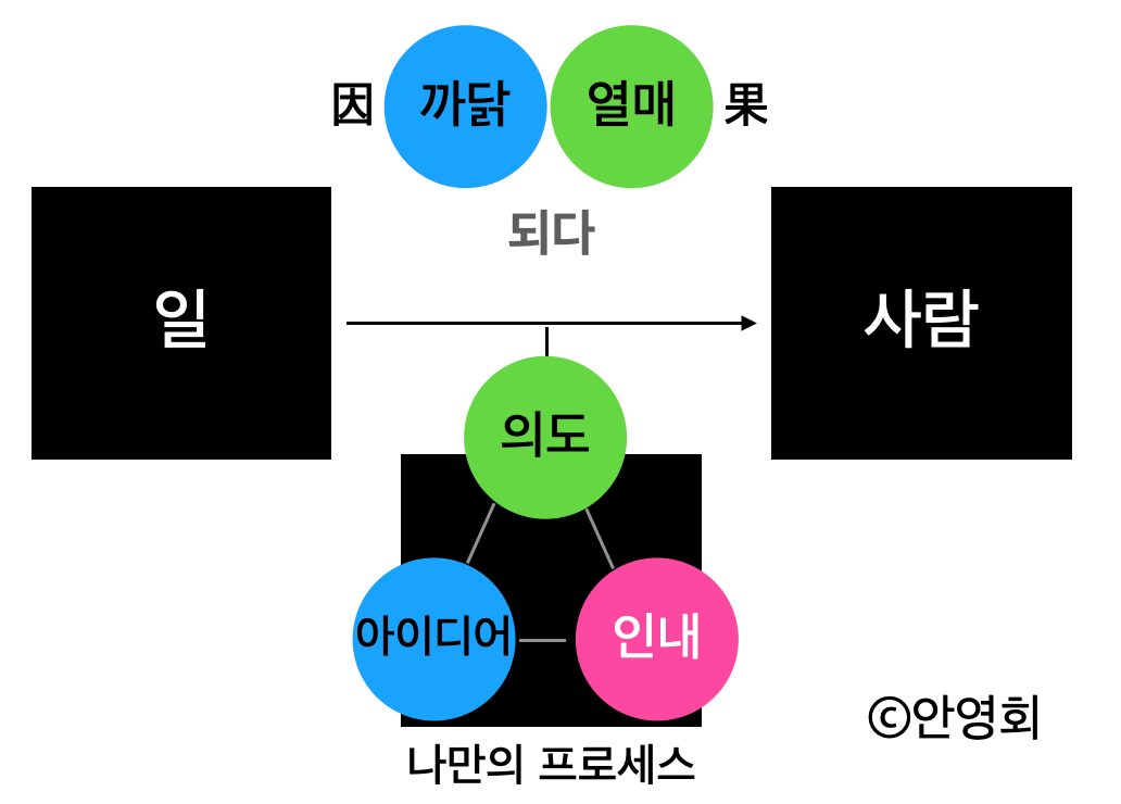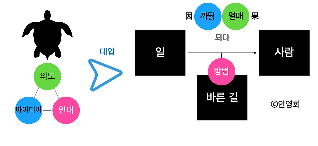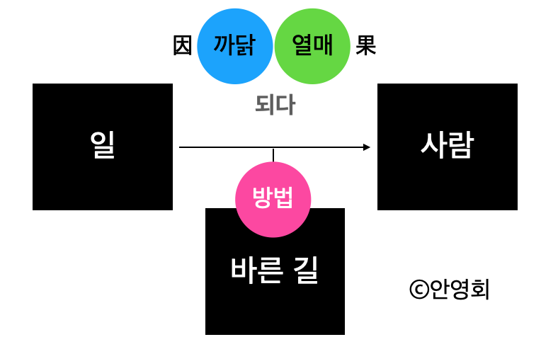 그림을 조금 더 풀어서 인과가 드러나게 했습니다. 그리고, 임자와 시공간이 만나는 개별성을 인과에 두면 이와 구분되는 바른 길이라는 방법을 인수분해하듯이 나눌 수 있습니다.