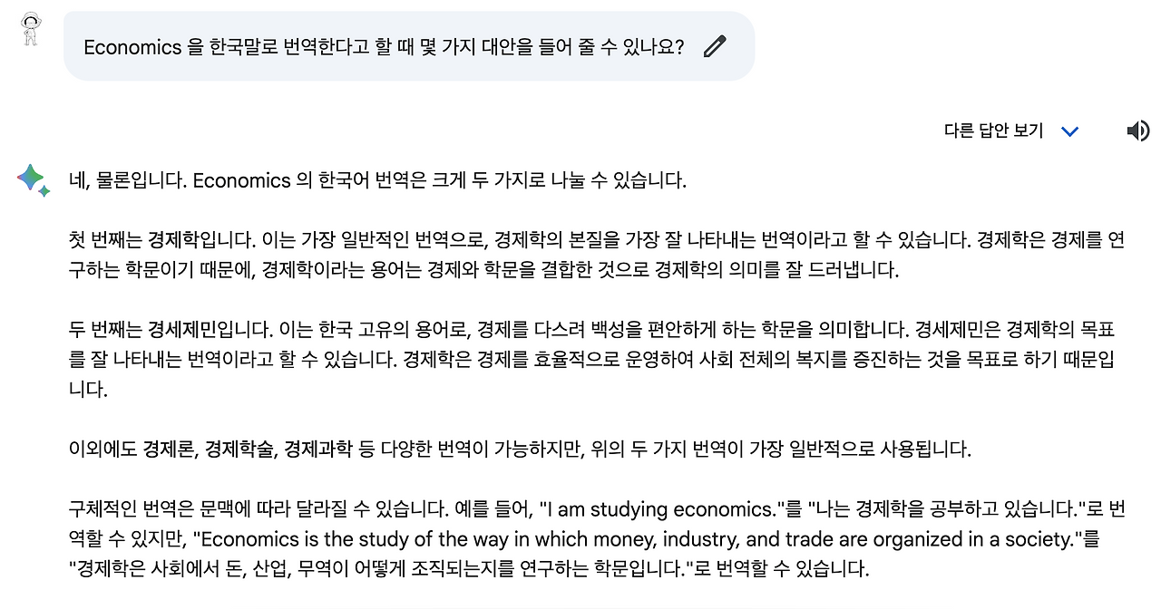 먼저 역자 관점으로 보겠습니다. 일단 해당 장을 번역할 때, 제목부터 난관이었습니다. 번역을 돕는 베타 리더분들도 economics를 '경제학'으로 하는 데에 이의를 제기했습니다. AI를 바탕으로 한다는 DeepL에게 몇 가지 대안을 묻습니다.