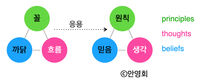 [3] 바탕은 <말의 탄생: 녀겨서 니르기>에 아래와 같이 그림으로 그렸던 최봉영 선생님의 풀이 즉, 말의 꼴, 까닭, 흐름 따위를 풀어내는 것을 의미합니다.