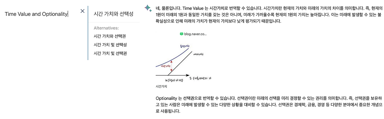 왜 중요하냐고요? 제가 고민하던 표현이 영국말 'Time Value and Optionality'를 한국말로 바꾸는 일입니다. 그 바탕[3]을 알기 위해 이 글을 쓰는 행동[4]으로 공부를 하는 것이죠. Optionality와 '옵션 가치'의 차이를 뒤에 다루기로 한다면, 일단 관련이 깊은 '옵션 가치'가 공식으로 등장했습니다.