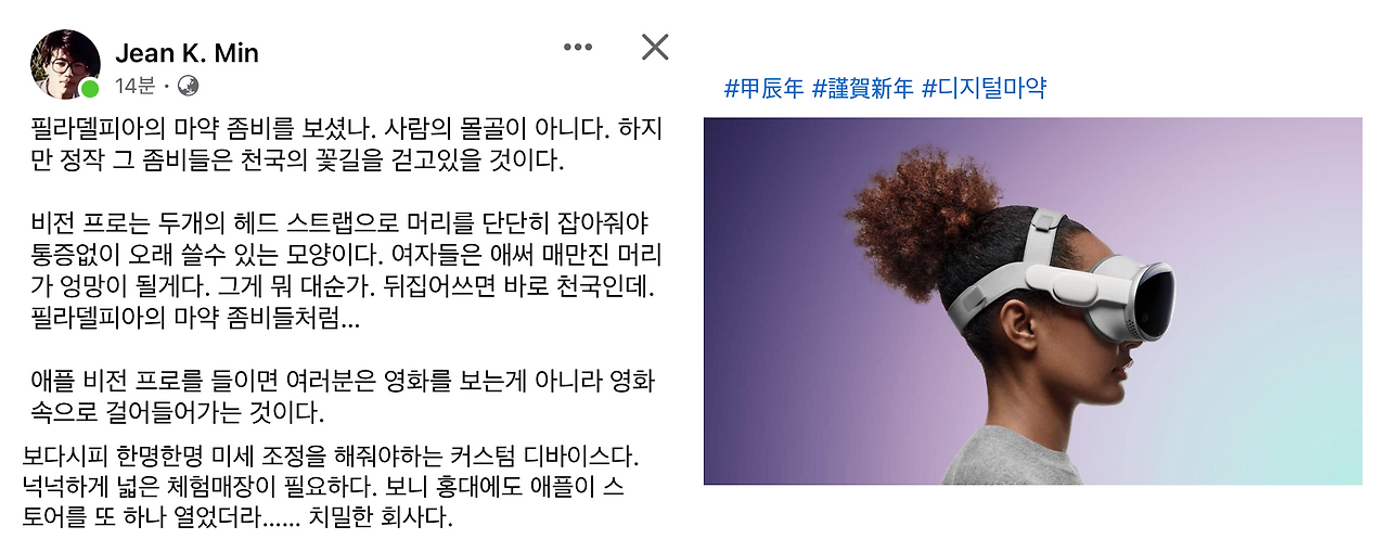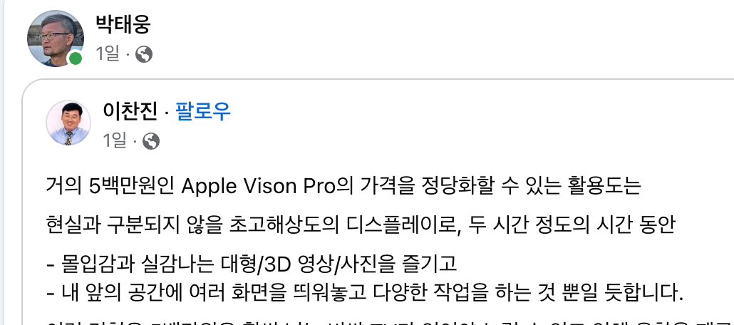 올해 들어 처음으로 애플 비전 프로 소식을 들은 통로는 박태웅 의장님 소개였습니다. 이찬진 님이 명료하게 정리한 분명한 쓰임새는 두 가지입니다. 하나는 앞서 소개한 디지털 마약(?) 용도고요.