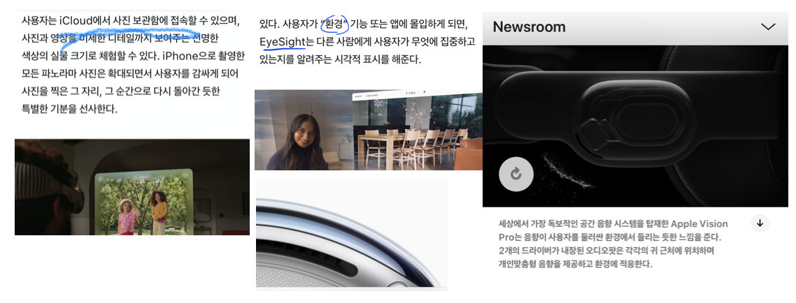 그 외에 인상적으로 본 관점은 애플의 발전 방향을 추정할 수 있게 한 내용이었습니다. 메타의 오큘러스와 달리 '환경' 기능을 통해 몰입에서 빠져나와 주변 환경을 인식하게 하는 부분은 이미 알려진 혁신입니다. 여기에 더하여 간과하기 쉬운 애플의 하드웨어 역량이 집약된 것으로 추측할 수 있습니다.