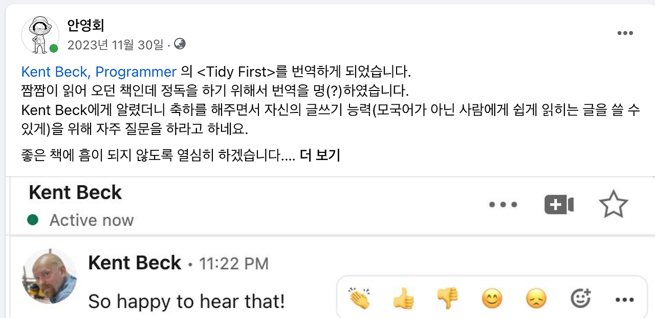 두 번째로 제가 <Tidy First?>를 번역하면서 배운 지식과 중국에서의 경험이 섞여서 새로운 아이디어를 샘솟게 했습니다.