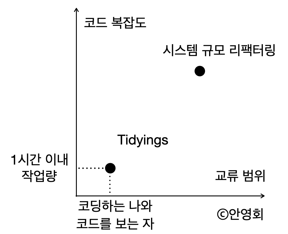 그 느낌을 그림으로 표현하고 싶었습니다. 저는 먼저 두 개의 축을 잡았습니다. 수포자를 벗어나려는 나의 지난한 노력과 잣대를 차리는 습관이 작동한 것입니다. 가로는 교류 범위라고 지었습니다. 혼자 개발하느냐 여럿이 협업하느냐의 문제죠. 일단, Kent Beck이 다루는 코드 정돈(tydings)은 개인 차원에서 '거울 속의 나(man in the mirror)'와 함께 시작합니다.