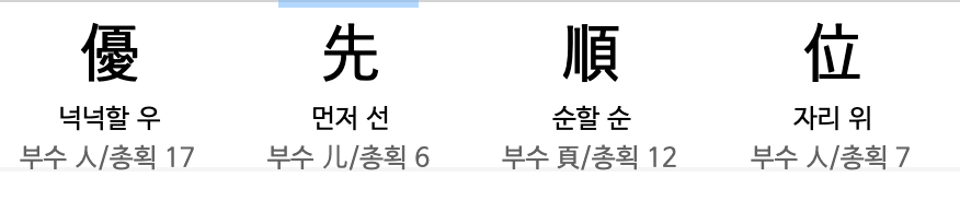 명사 '우선-순위(優先順位)'는 다음 한자 구성을 가진 낱말이다.