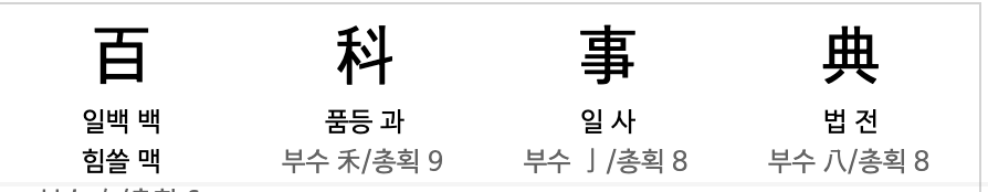 명사 '백과-사전(百科事典)'은 다음 한자 구성을 가진 낱말이다.