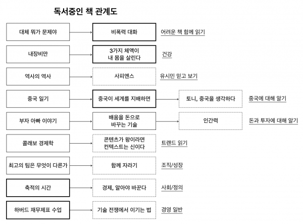 그래서 중국에 있을 때 시작했던 <읽고 있는 책을 돌아보고 관심 분야에 집중하게 하기> 형태를 차용해서 브런치 연재 현황을 그려 보기로 합니다.