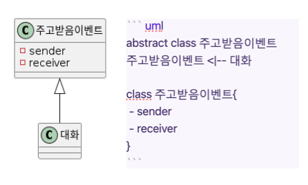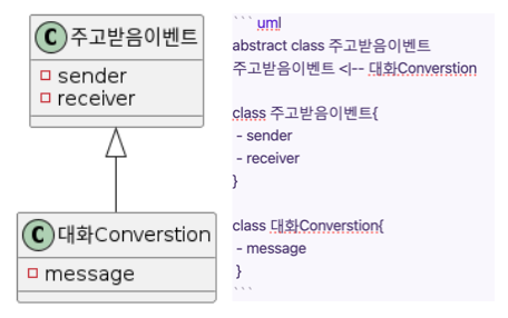 우리는 Cloud Native라고 부르는 통합 전략 그리고 '정보 자산을 개별 메뉴와 연결하는 UX 제공하기'를 위해서 이벤트를 표준 프로그래밍 모델로 채택할 예정입니다. 그에 준하여 처음으로 손때를 묻혀 봅니다. 왼쪽은 제가 좋아하는 UML 클래스도이고, 우측은 두레이가 지원하는 PlantUML 표기입니다.