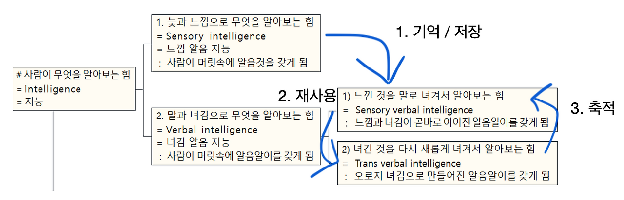 그리고 앞서 이러한 '알아보는 힘'을 지능이라고 했습니다. 그리하여 둘로 나눠 <지각(느낌 알음)과 생각(녀김 알음)으로 알아보기>에 쓴 내용과 3번 포기말은 같은 내용입니다. 또한, 다음 그림이 표현하는 내용이기도 합니다.