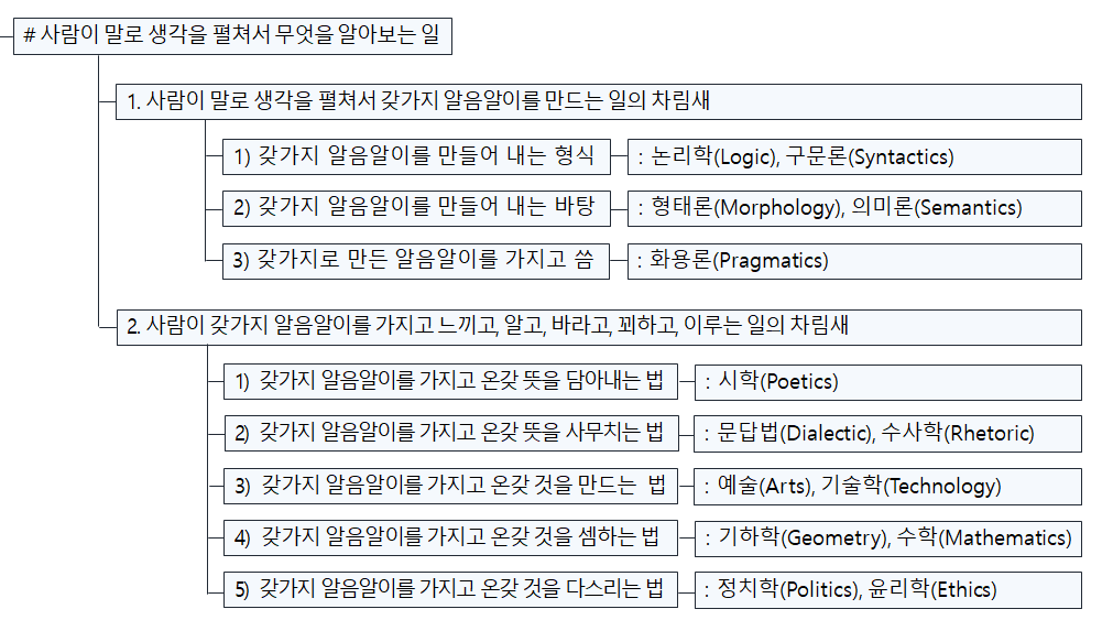 아무튼 이를 철학이라고 보면, 아래 도식은 통째로 '철학'을 표현한 것으로 보이기도 합니다. 물론, 박구용 교수님은 인류의 학문 체계 상에서 철학을 말한 것이고, 인용한 도식은 최봉영 선생님께서 한국말로 풀어낸 인문학적 지식의 일부입니다. 일단 저는 아래를 철학과 유의어라고 보겠습니다. 최소한 당분간은요.