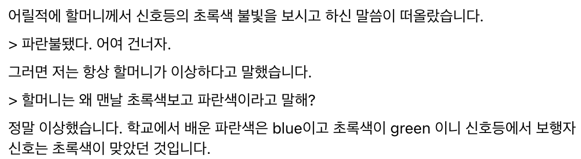 한국사람은 '파래'에서 볼 수 있는 빛깔을 바탕으로 "파래는 파랗지."라고 말한다.