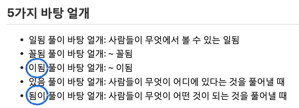 한국말 말차림법 묻따풀 미팅에서 동료들이 '일됨'을 이해하는 데 어려움을 겪었습니다. 최봉영 선생님을 대신해서 제가 이해한 바를 설명하다 보니 어느새 조금 더 알게 되었습니다. 하지만 여전히 부족하다고 느낀 부분이 있었는데, '됨'에 대한 이해 부족이라 느꼈습니다.