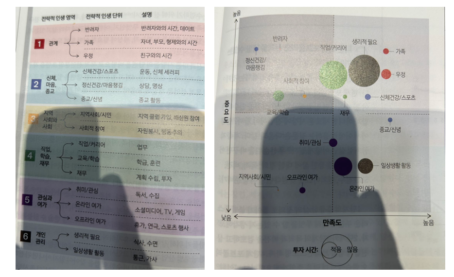 글을 마무리하기 전에 마지막으로 기사에서 당장 눈에 띈 내용 하나를 더 공유합니다. 전략적 인생 영역을 6갈래 나눈 항목과 이들에 투여하는 시간을 시각화하는 그림은 본보기로 좋을 듯합니다. 언젠가 실제로 활용하게 되면 글로 남겨 보겠습니다.