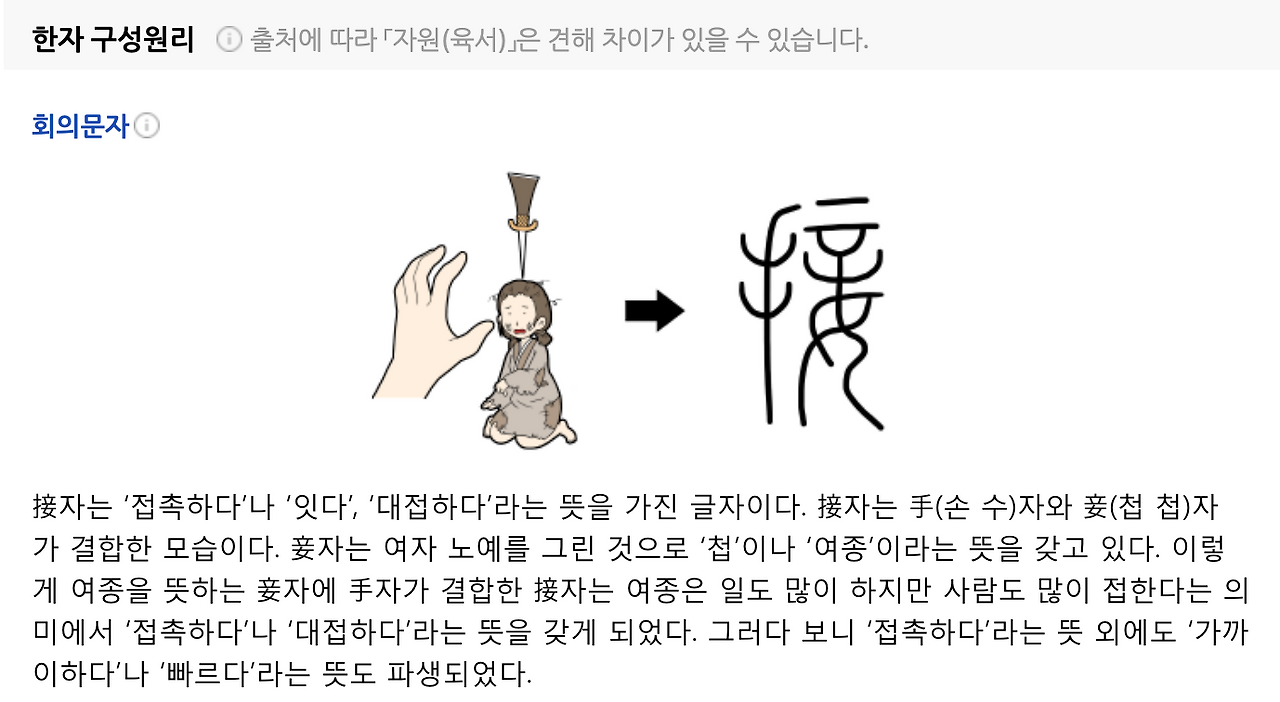 <낱말의 뜻을 깊고 넓게 묻고 따지는 일의 소중함> 실천을 위해 接(이을 접)을 사전에서 찾아보았는데 과거의 구태가 드러나는 다소 거북한 풀이를 만날 수 있었습니다.