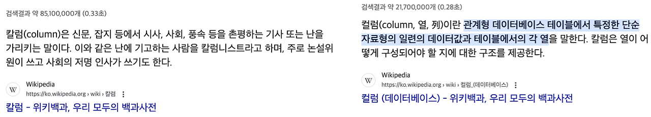 영어 단어 Column인데요. 신문 기사에서 쓰일 때 우리말은 '칼럼'이고, 프로그래밍 과정에서 쓰일 때 우리말은 '컬럼'입니다. 제 취향과 무관하게 구글링 결과가 그렇습니다.