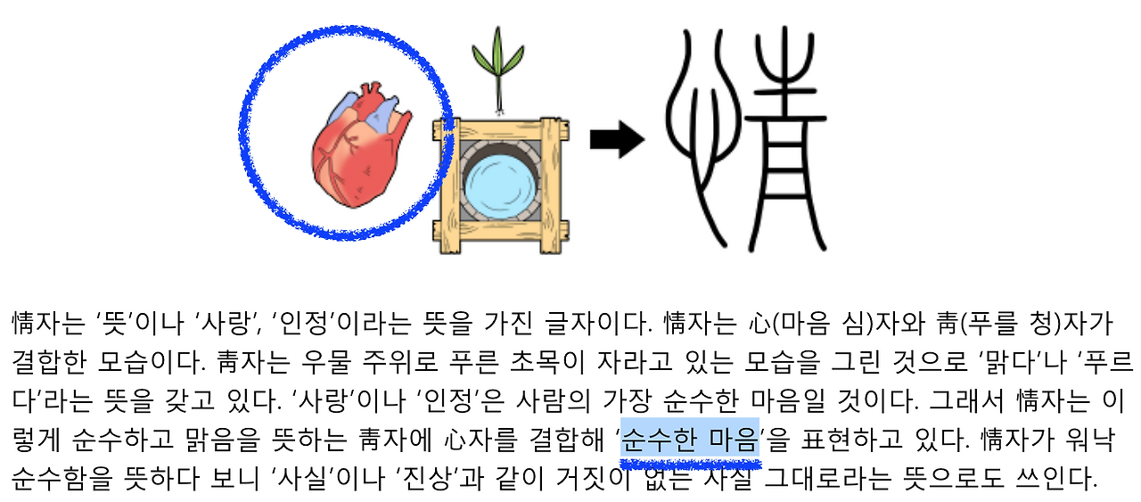'뜻을 느낀다'로 풀 수도 있을 듯합니다. 네이버 한자사전에 의지하여 씨말인 정(情)이 무엇인가 하고 또 묻따풀합니다. 뜻, 사랑, 인정 따위를 나타낸다고 합니다. 멋지네요. 씨말까지 즉, 요소까지 풀어 보길 잘했습니다. 한자 풀이에 드러난 심장 이미지가 눈에 띄네요.