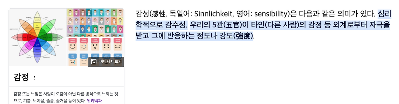 이번에는 화제를 다시 감정과 감성 구분으로 돌아가 봅니다. 파파고에서 '감정의, 감정적인, 감성적인'을 순서대로 넣어보면 모두 영어로 Emotional이라고 번역합니다. '감정'과 '감성'을 키워드로 각각 구글링을 했습니다.