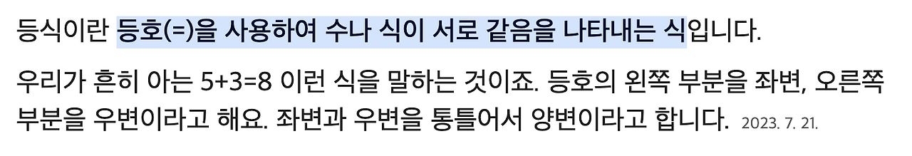 <낱말의 뜻을 깊고 넓게 묻고 따지는 일의 소중함>을 실천하기 위해 사전에서 등식의 풀이를 찾습니다. 수학 개념 말고도 다른 풀이가 하나 더 있었습니다.