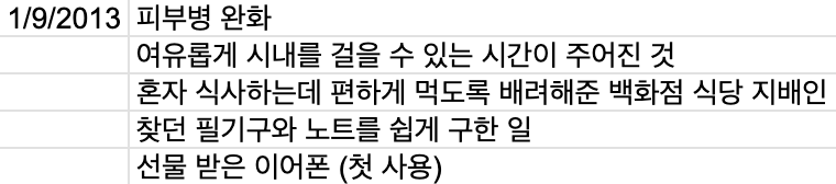 첫 번째로 감사 목록 쓰기는 정확하게 언제 시작했는지 알 수 없지만, 종이로 쓰던 기록을 구글닥스로 옮긴 후의 흔적을 찾을 수 있었습니다. 기록을 찾아보니 2013년 1월 9일 첫 기록이 있습니다.
