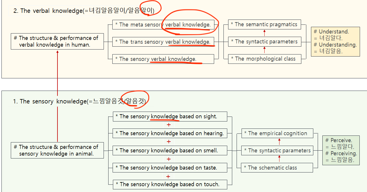 최봉영 선생님에 따르면 말(verbal knowledge)로 바뀔 수 있어야 비로소 개념화가 가능하다 합니다. 최봉영 선생님은 개념화란 말을 쓰지는 않았습니다. 인용한 그림처럼 감각과 연결할 수 있는 알음알이가 감각을 넘고 메타 차원으로 활용할 수 있는 지식을 알음알이라고 하셨죠. 이를 제가 잘 아는 현상에 대응시켜 보니 '개념화'란 말이 떠올라 썼습니다.