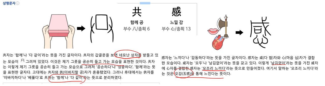 사전에서 공감을 뜻을 찾는 일로 <낱말의 뜻을 깊고 넓게 묻고 따지는 일의 소중함>을 실천합니다. 共(함께 공)과 感(느낄 감)을 씨말로 합니다.