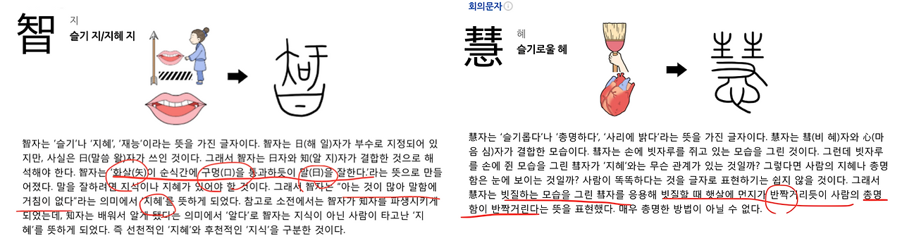 씨말로는 한자어 智(지혜 지)와 慧(슬기로운 혜)가 쓰였습니다. 한자 사전도 찾아봅니다.
