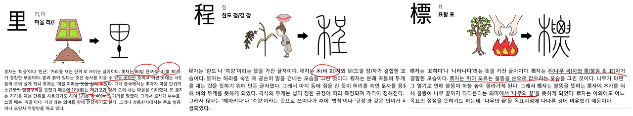씨말로 쓰인 한자는 里(마을 리), 程(단위 정)과 標(표 표)입니다. 이들도 한자 사전에서 찾아봅니다.