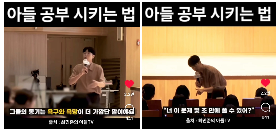 대신에 아들 공부에 활용하려고 보관해 둔 영상의 한 장면으로 설명을 대신합니다. 인스타 추천에서 본 영상에서는 아들 공부를 시킬 때 엄포나 위협 대신에 욕구와 욕망을 활용하라고 말합니다. 도덕을 강조할수록 인간에 대한 무지는 더 깊어지는 듯합니다.