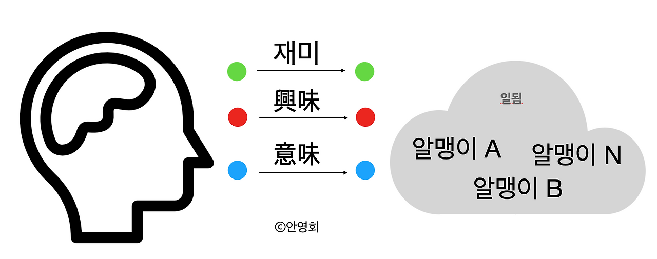 순환 참조로 느껴지는 내용을 보면 하나의 패턴이 보이는 듯합니다. 뜻은 씨말 意(뜻 의)와 일치합니다. 그런데 세 번째 풀이에 있는 '가치'는 어디에 대응할 수 있을까요? 자연스럽게 <가치를 어떻게 판단할 것인가?>에서 생각한 내용이 소환됩니다.