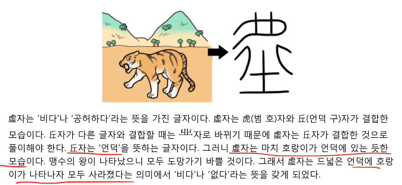 그리고 '허虚'를 사전에서 찾아봅니다. 여섯 가지가 풀이가 있지만, 다음 두 풀이를 섞으면 앞서 찾은 글에서 제가 '허虚'자를 풀며 느낀 느낌과 유사합니다.