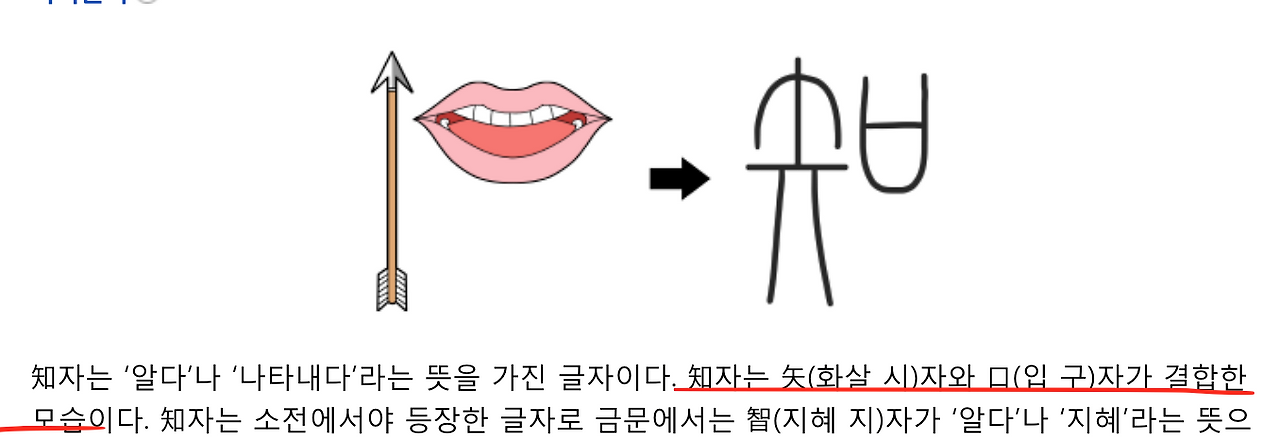 '지知'는 입에서 혀로 느끼는 것에 바탕을 두고 있다. 지知는 화살을 뜻하는 시矢와 입을 뜻하는 구口가 합쳐진 낱말로서 입에서 혀로 맛을 아는 일이 화살처럼 빠르게 이루어지는 것을 나타내고 있다.