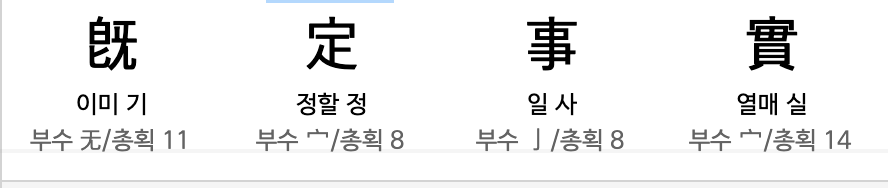 명사 '기정-사실(旣定事實)'은 다음 한자 구성을 가진 낱말이다.