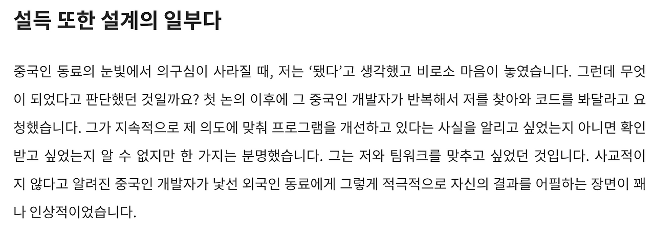 이미 요즘IT에 썼던 설계 관련 글에서 '설득 또한 설계의 일부'라고 주장한 이유도 비슷한 맥락입니다.