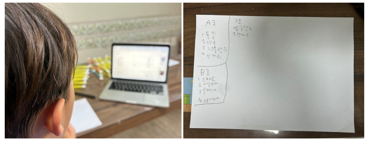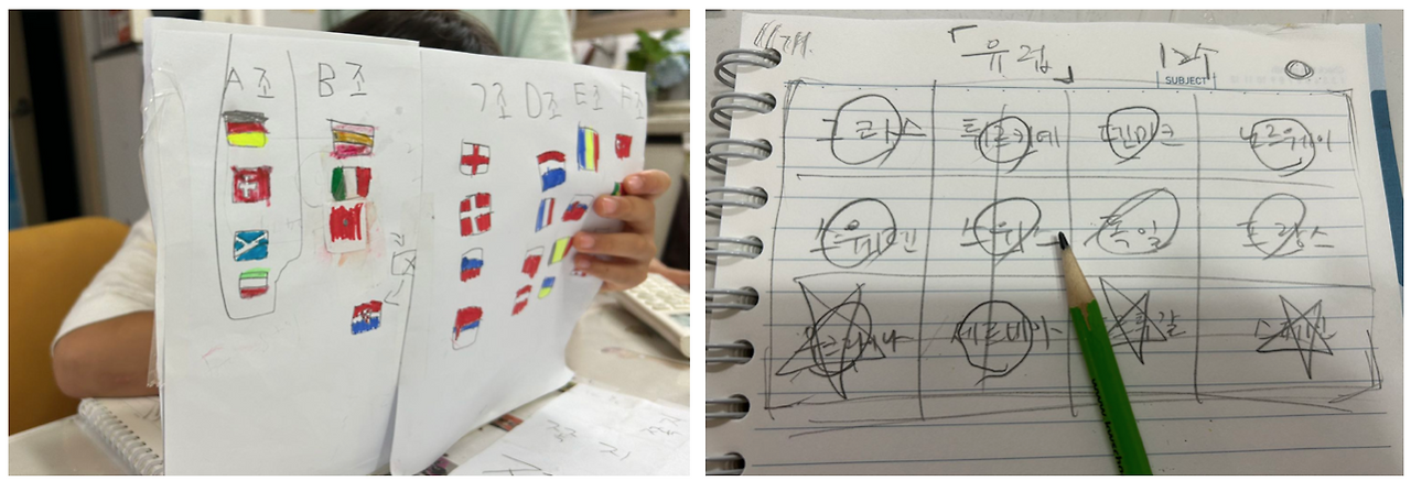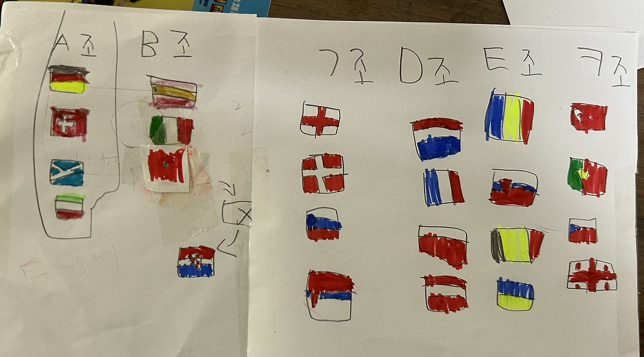 그래서 유로 2024 조별 리그 배정표를 보여주었습니다. 아직 한글에 익숙지 않지만 축구에 대한 관심사를 활용해서 글자를 따라서 쓰게 유도한 것이죠.