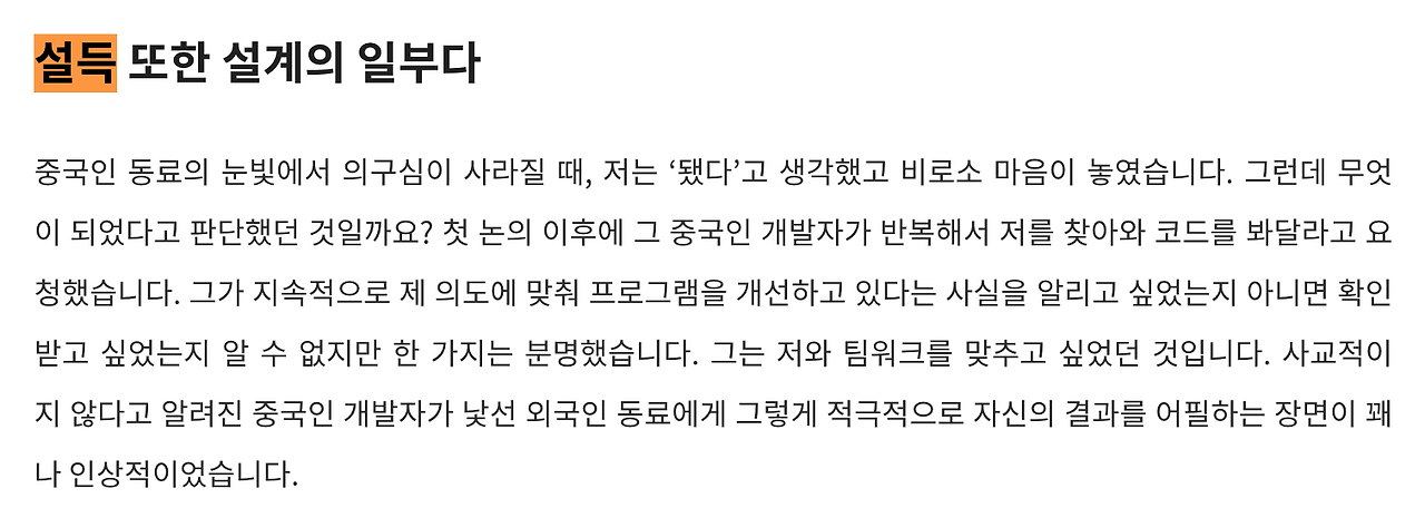 요즘IT 올린 설계에 대한 글을 쓸 때 '설득 또한 설계의 일부다'라는 표현이 마음에 들지 않았습니다. 다만 더 나은 대안이 떠오르지 않아 찜찜한 마음으로 선택한 표현이 '설득'이었습니다. 그런데 이를 설득이라 하지 않고 자기 중심성을 벗어나서 팀 중심성으로 나아가는 일이라고 생각하니 설득이란 말이 주는 찜찜함이 사라지는 듯합니다.