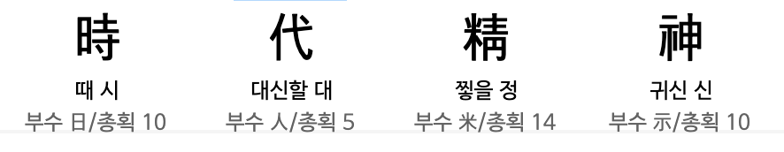 명사 '시대-정신(時代精神)'은 다음의 한자 구성을 가진 낱말이다.