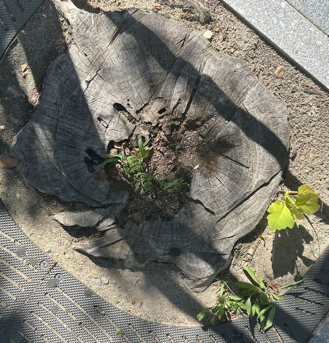 한편, 며칠 후에도 루틴을 치른 후 걷는 길에 제 몸이 비슷하게 구동(?)했습니다. 구동이란 표현이 마음에 듭니다. 암튼 그건 차치하고 잘려 나간 가로수 그루터기 사이를 비집고 풀이 자라는 모습이 보였습니다.