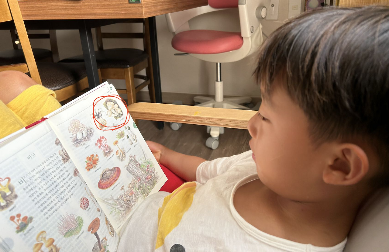 아이가 사전의 그림을 보고 마당에 핀 버섯이 저도 모르는 '침비늘버섯'이란 사실을 알려줍니다.