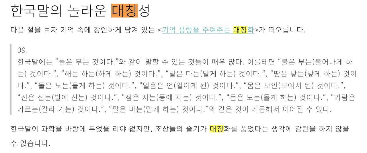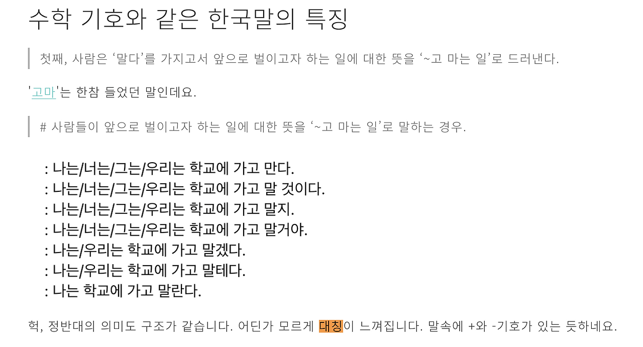 앞서 언급한 마디말의 구성 방식의 또 다른 양상이라 할 수 있습니다. 씨말에서 마디말로 나아갈 때뿐 아니라 마디말과 마디말을 덧붙여 포기말이 만들어지는 단계에서도 역시 대칭적인 확장이 가능합니다. '왜 그럴까?' 질문을 던져 보면 <작동하는 지식과 기억 용량을 주여주는 대칭화>라는 문구에 답이 있습니다. 바로 박문호 박사님이 소개한 대칭화의 이점이죠. 지식의 작동과 기억 효율이 뛰어나니까요.